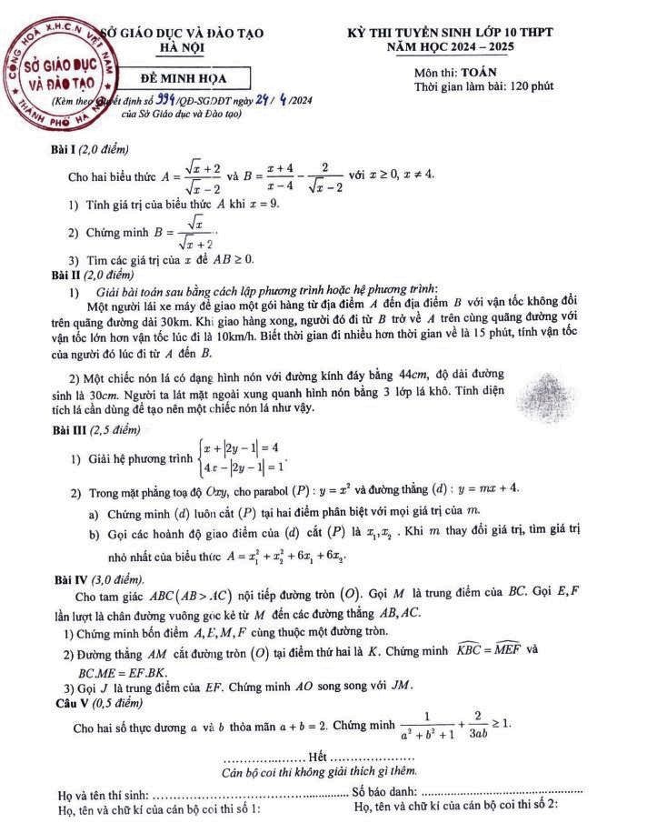 Đề thi vào lớp 10 THPT năm 2024 - 2025 môn Toán - Phòng GD&ĐT Hà Nội